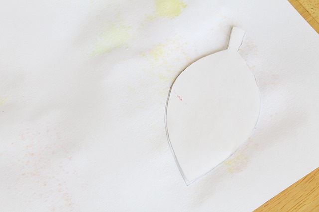 Print off the leaf template from this site and cut the leaves out. Flip your works of art over and trace the leaf shape on the back (make sure they’re in the right position so you don’t accidentally cut more white than watercolor).